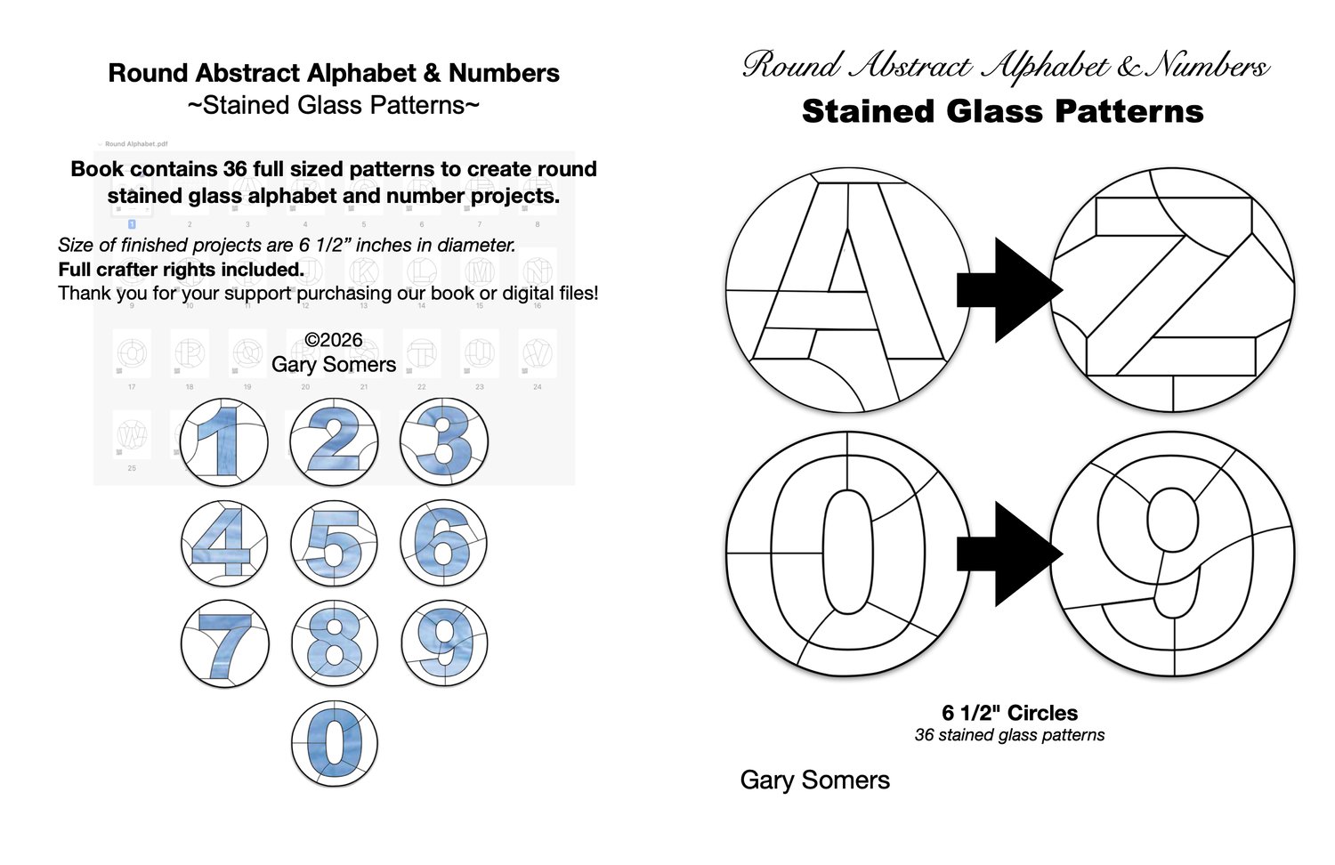 Book contains 36 full sized patterns to create round stained glass alphabet and number projects.